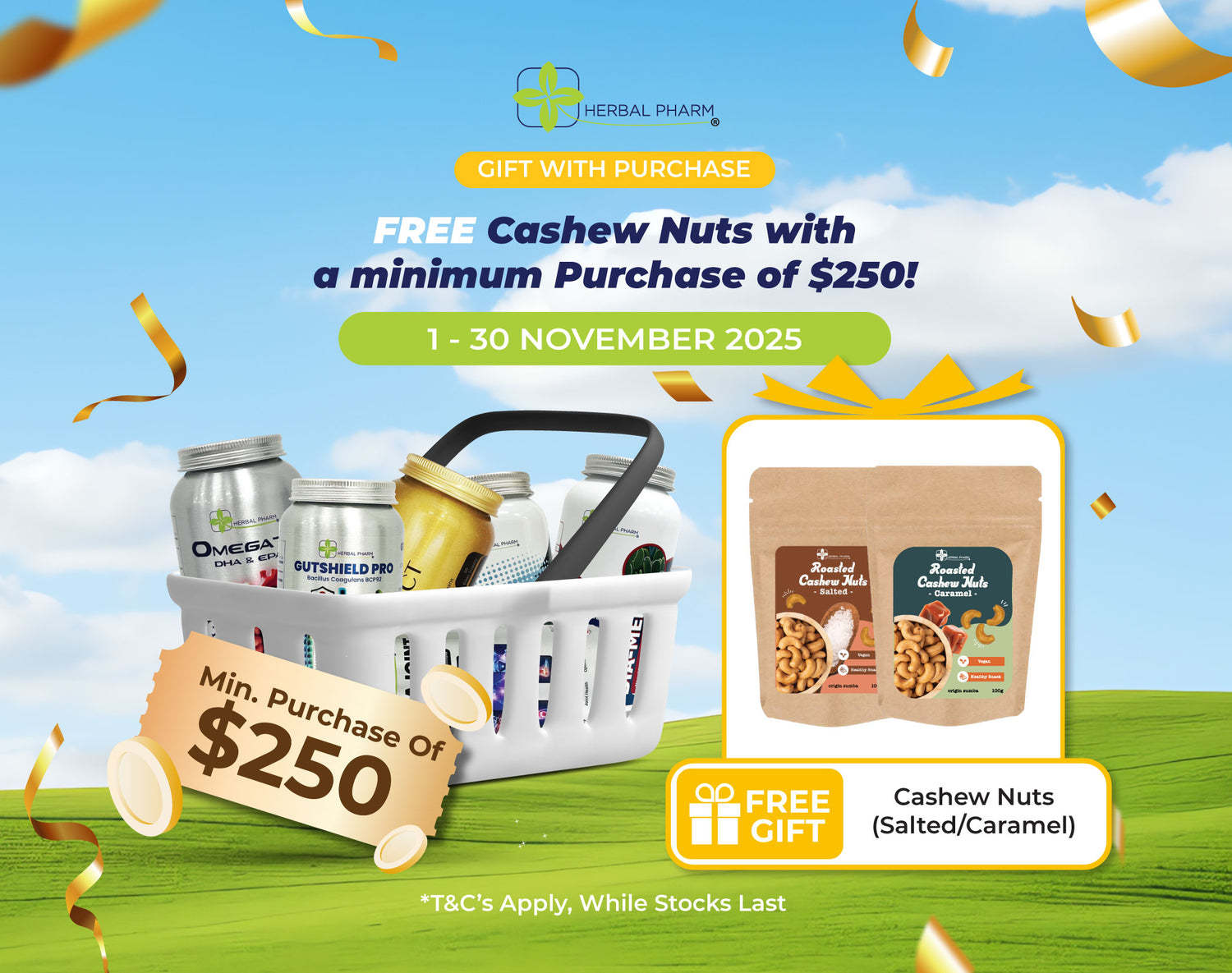 Get a FREE pack of Cashew Nuts (choose Salted or Caramel) with a minimum spend of $250!