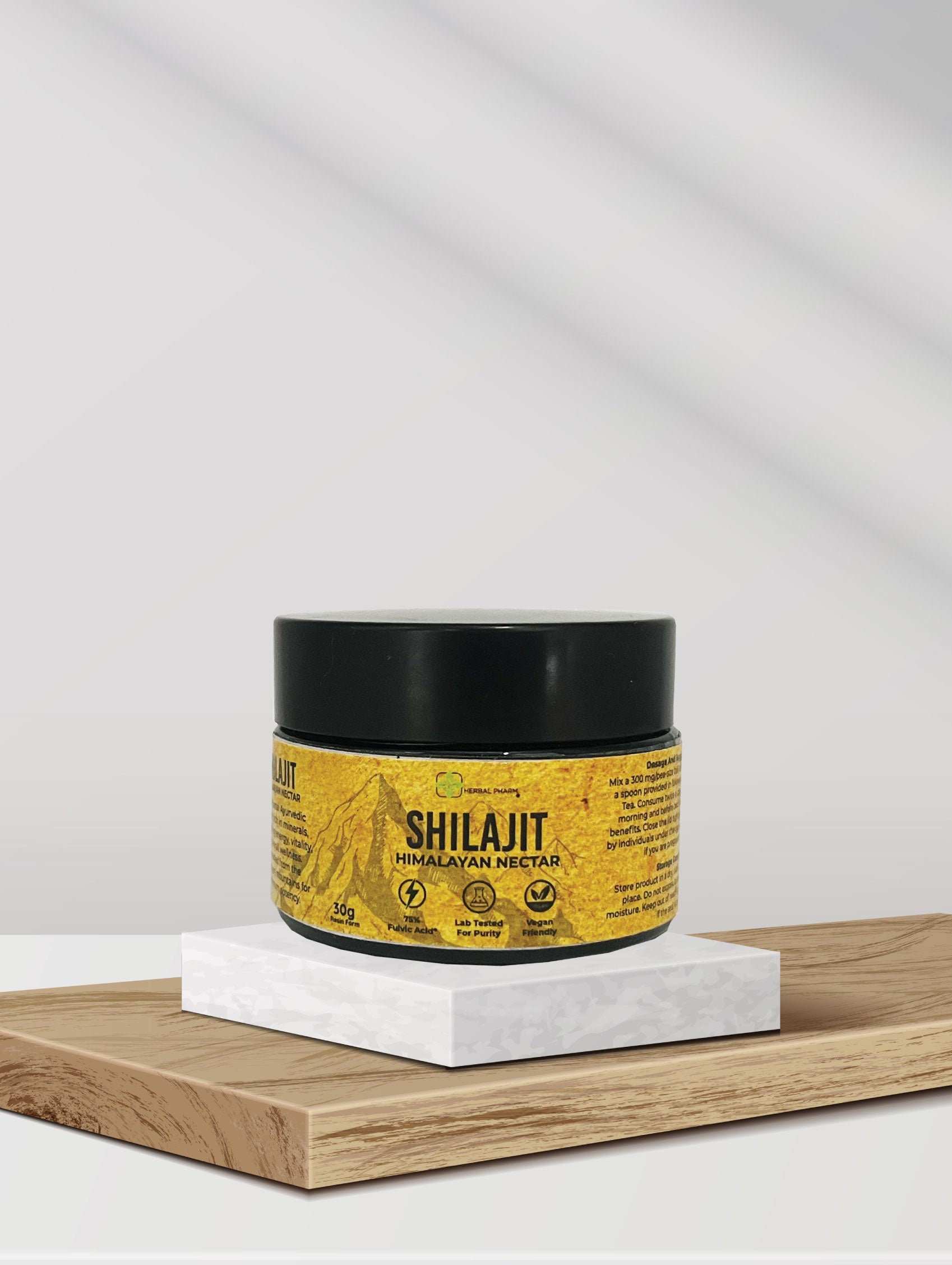 Each serving (300 mg pea-sized ball, taken twice daily) contains Shilajit Resin 300 mg.