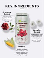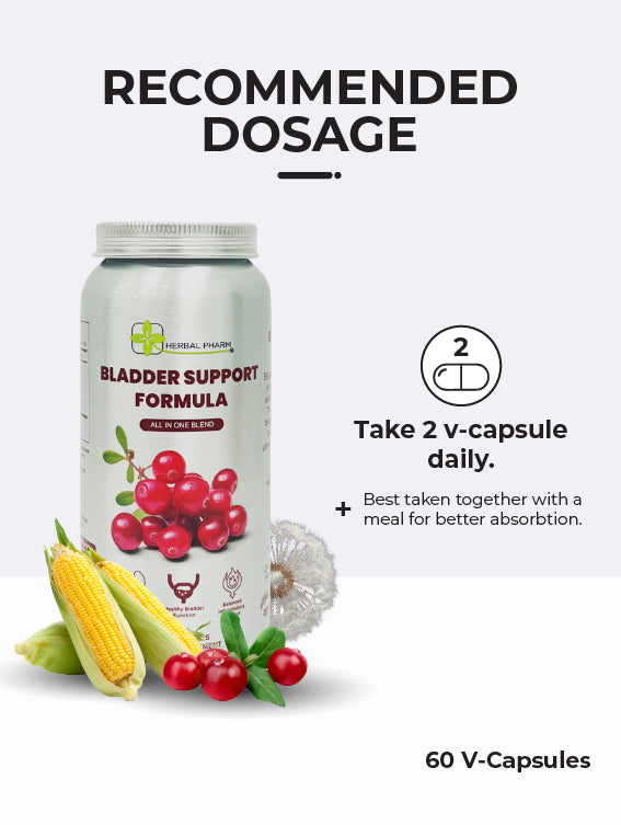 Each serving (2 capsules) contains Bladder Support Blend 700 mg, comprising Dandelion extract, Corn Silk, Stinging Nettle, Cranberry extract, Buchu, and Parsley, along with Vitamin C (ascorbic acid) 120 mg. Other ingredients include Hypromellose, Microcrystalline Cellulose, Vegetable Magnesium Stearate, and Silicon Dioxide.